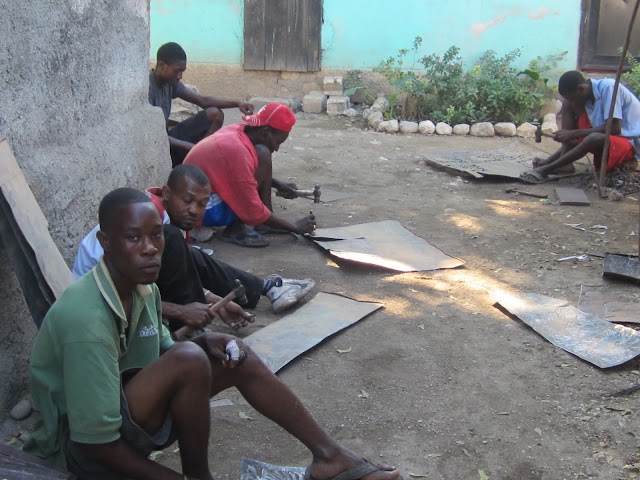 Yesterday, we traveled to the “tin market” where Haitians craft beautiful designs out of tin or sheet metal. They search throughout the city, combing thru garbage, finding any type of metal that they can redesign into an art piece that they can sell. They spend days working on just one item, sitting on the ground, using a hammer and several small hand tools to reshape the tin. They pound hundreds of indentations into the material, polishing it with rags until it is reformed into a piece of art to be sold at the tin market. Some items sell for as little as a dollar, others for over twenty, taking several days or a week to complete.
