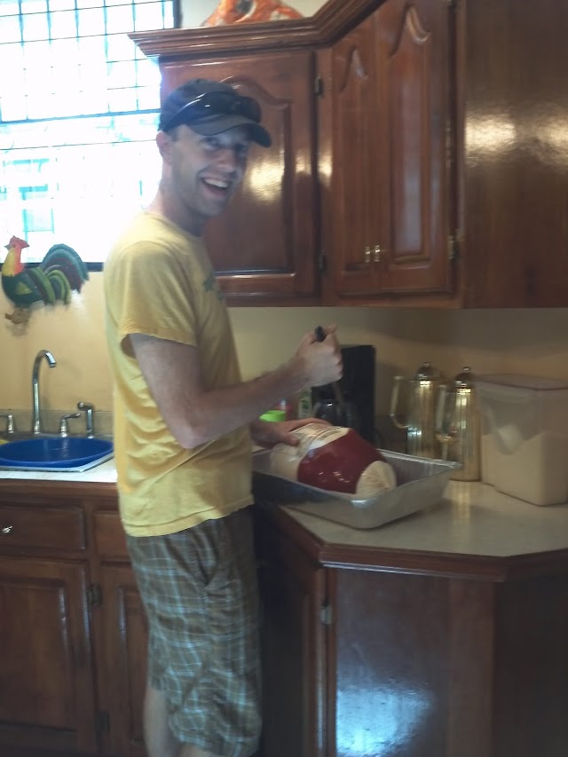 We have never made a turkey before so we were YouTube-ing it up and watching and re-watching how to cook a turkey. It was pretty funny having the computer next to us as we attempted to figure out how to create and marinade, arrange the wings, take out the neck and finally the giblets (or the geckos as I accidentally called them 🙂 ). Now to attempt to cook the turkey. Our oven has two settings – off and ON. I ever so slightly would turn the nob from off to on by inch-ing the dial attempting to burn at low heat by looking at the fire underneath the propane stove. It wouldn’t stay at low heat and I would come back to re-visit the setting every 15-30 minutes.