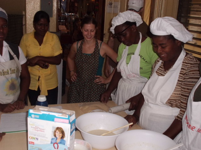 • Melissa got to teach at the Heartline cooking school this past Thursday.   We made banana bread and scalloped corn bread.  I had to type out the recipe in advance – IN CREOLE!  It was a fun challenge, and it stretched my vocabulary skills.  I also taught all IN CREOLE!  I used a lot of charades – showing things with my hands, but I think they got the general idea 🙂