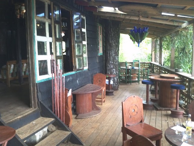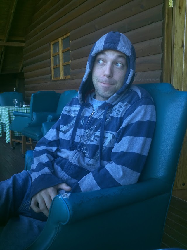 Having a soda at the rustic hotel