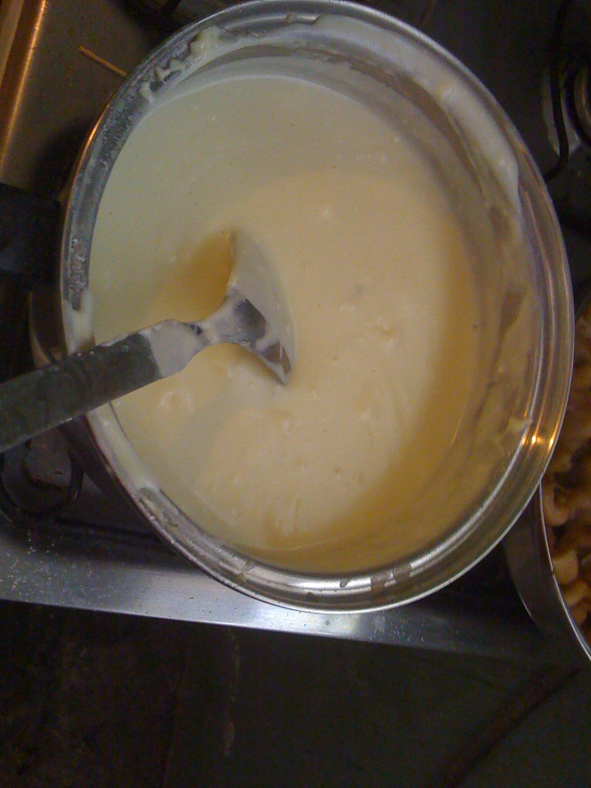 In medium saucepan, melt 3 Tbsp. butter. Add a large spoonful of flour and several cups of milk. Heat to a boil until it thickens. Stir continuously! If sauce is chunky when thick, you can pour it through a fine strainer to remove chunks.