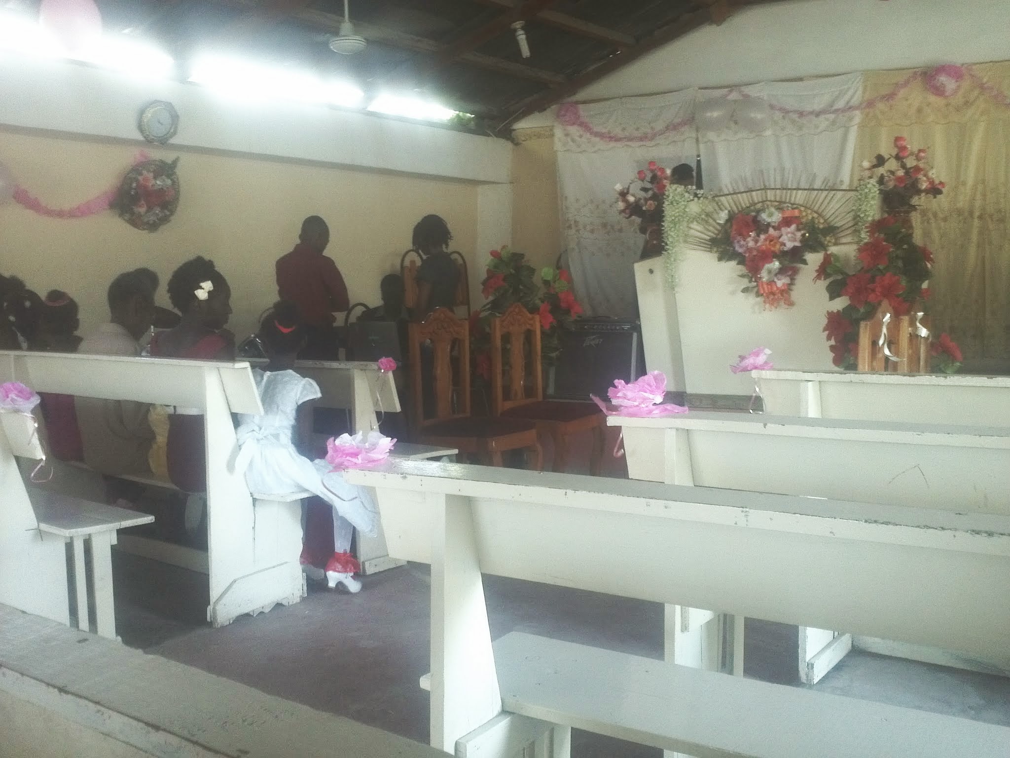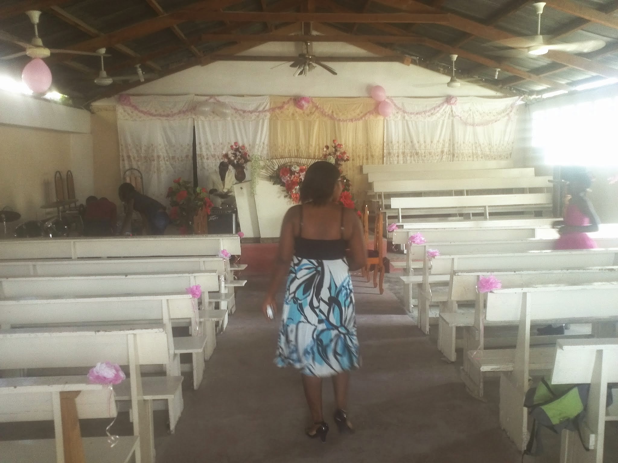 We arrived at the church and found Risline, in her wedding dress, and her husband to be sitting with all the doors and windows open in a car. We waved to them and then took a place in the church under a ceiling fan :-D.